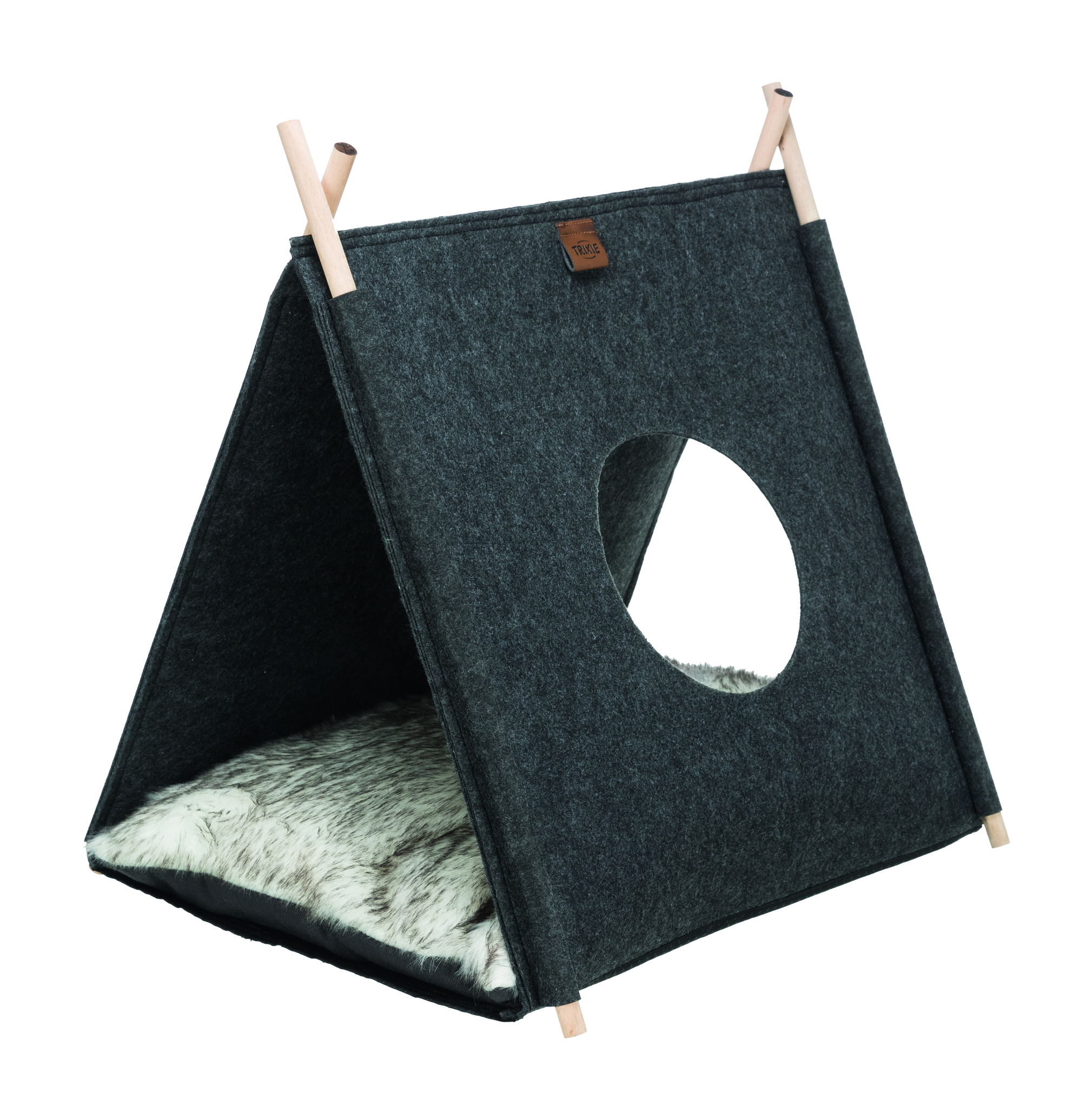 De Trixie Kattenmand Tent Elfie Met Kussen Vilt Antraciet 50 x 46 x 52 cm is een schuilplaats voor de kat, een tipi tent gemaakt van vilt met omkeerbaar kussen. Echt lekker wegdromen doet jouw kat of kleine hond in deze leuke schuiltent van Trixie. Deze tent is gemaakt van vilt met een frame van hout, dat inklapbaar en ruimtebesparend op te bergen is. De tent is voorzien van een omkeerbaar kussen met een overtrek met aan één zijde langharig pluche om lekker in weg te kruipen en aan de andere kant geweven stof, gevuld met comfortabel polyesterfleece. De slipvaste onderkant zorgt er bovendien voor dat de tent niet kan verschuiven bij het in- en uitstappen.